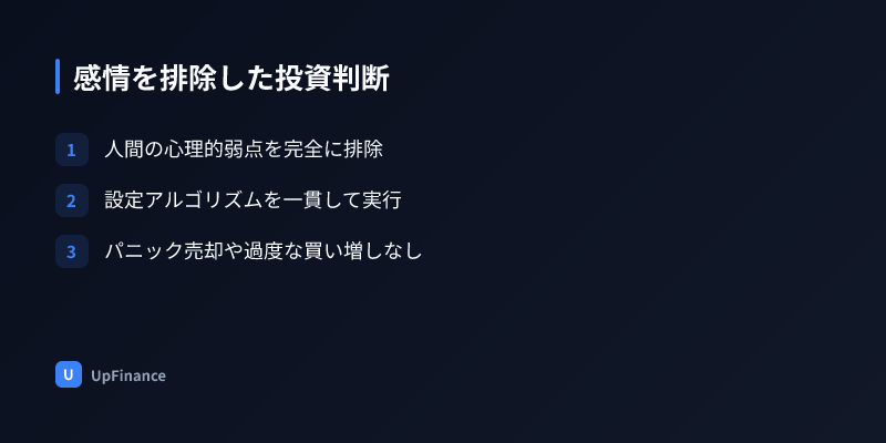 AI自動投資の最大の利点は、感情的な判断を完全に排除できることです。 投資家は価格下落時にパニック売却、急騰時に過度な買い増し衝動を感じます。機械はこうした心理的な弱点がなく、設定されたアルゴリズムを一貫して実行します。