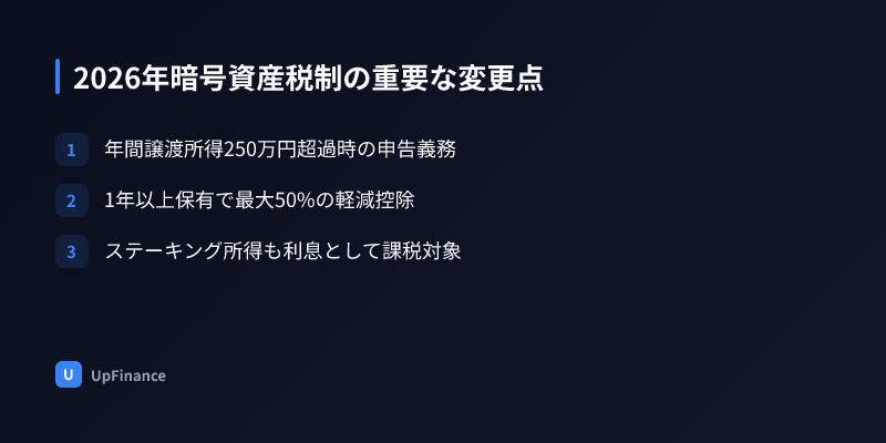 暗号資産への注目の高まりとともに、税制整備も着実に進んでいます。2026年の重要な変化を正確に理解し、準備することが、投資家としての基本的な義務であり、スマートな資産管理の方法です。