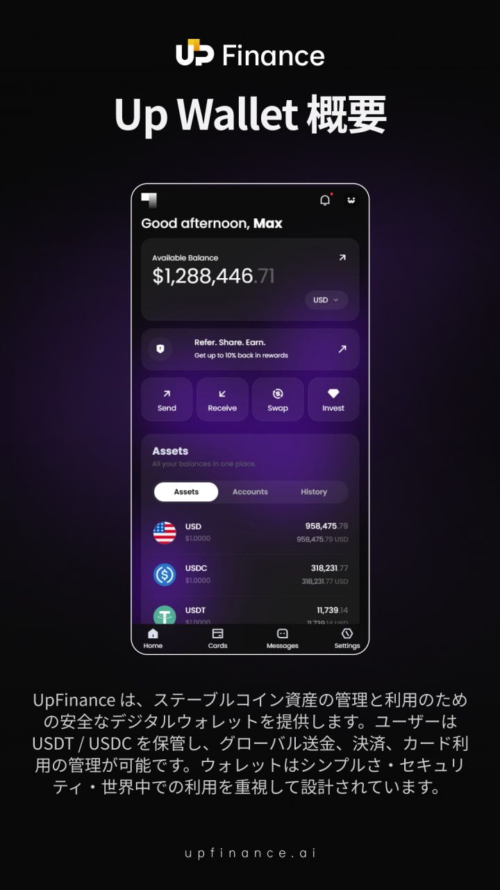 UpFinanceは USDT・USDC など主要なステーブルコインに対応し、保有だけでなく実用性を重視しています 💼